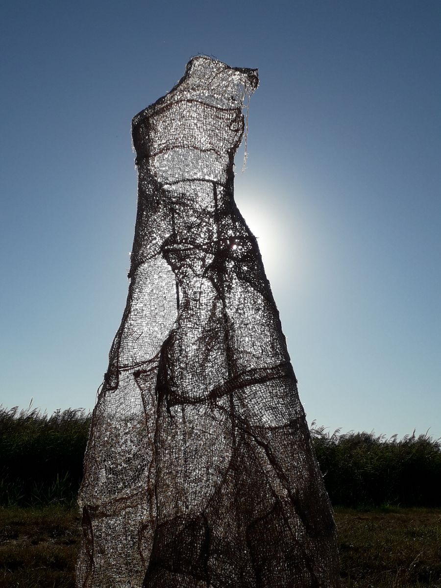 De afgelopen weken werkte ik samen met Marion Steur vanuit een glazen container in Earnewald als onderdeel van Ljochtstill, een project over landschap, cultuur, identiteit en verstilling. Wij werkten aan een beeldende vertelling. Een serie beelden van een vrouw die oprijst uit het veen. Wat ook symbool staat voor het gebied. 5 beelden van kippengaas en heel open jute. Mooie open vormen die een plek kregen langs een wandelpad in de natuur.