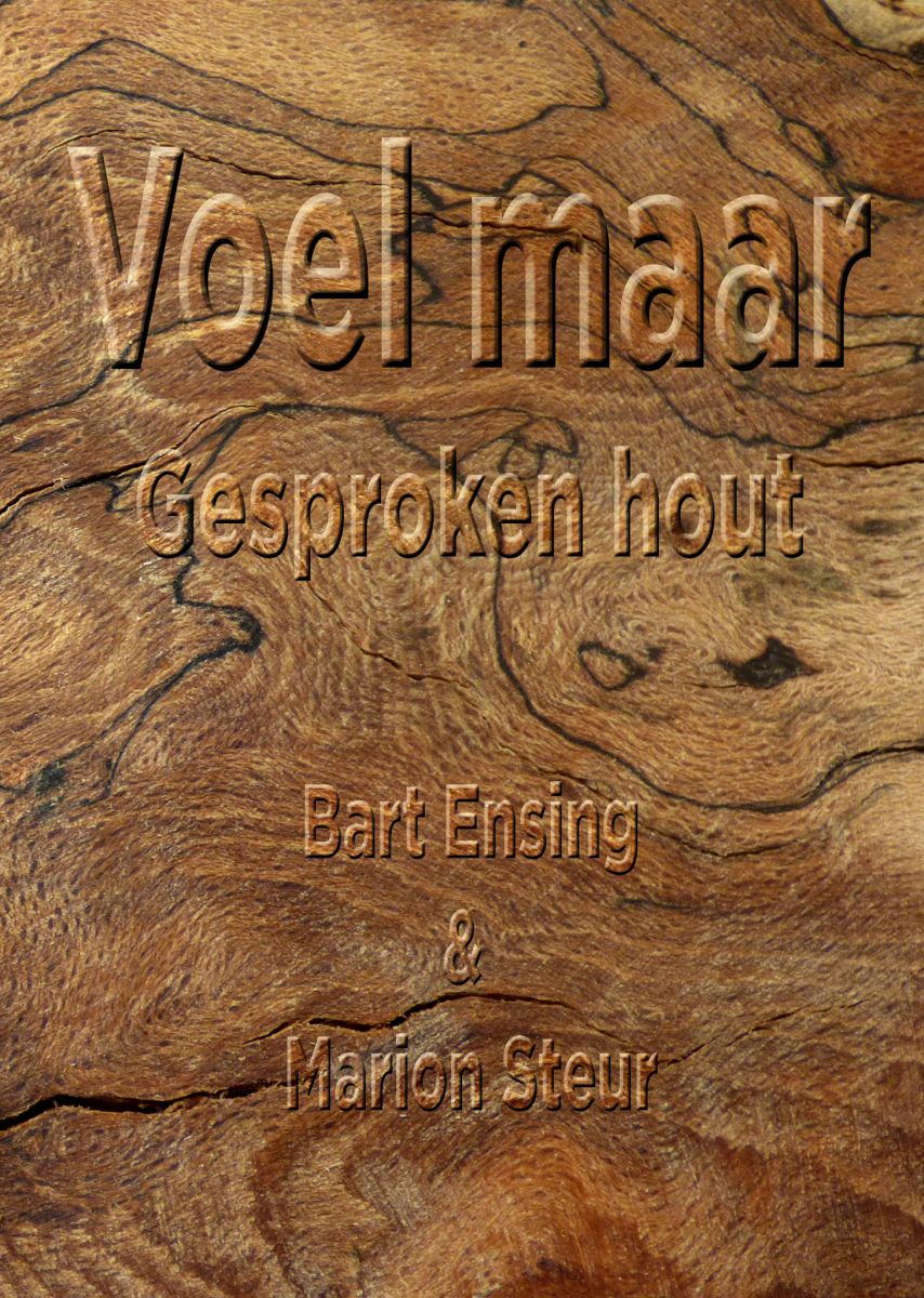 Steur het gedicht KOM bij 'mijn' vier meter grote Wandelaar. Sindsdien schreef ze ook af en toe gedichten bij mijn houtsculpturen. Ze bekijkt mijn beelden van alle kanten, laat ze op zich inwerken. Zo ontstaan er woordenflarden, zo ontstaan er gedichten. Waarmee ze niet per se weergeeft wat ik met een beeld bedoeld heb, het gevoel dat ik er bij heb. Maar wel steeds geldt dat het gevoel dat de gedichten bij me oproepen voor mij klopt met het beeld.Die gedichten hebben we nu, met de foto's van de beelden, samengebracht in de bundel 'Voel maar. Gesproken hout'. Een prachtig hardcover boekje, met 20 beelden en 20 gedichten op een bijna zwarte achtergrond, met wit leeslint. Ik ben er trots op.