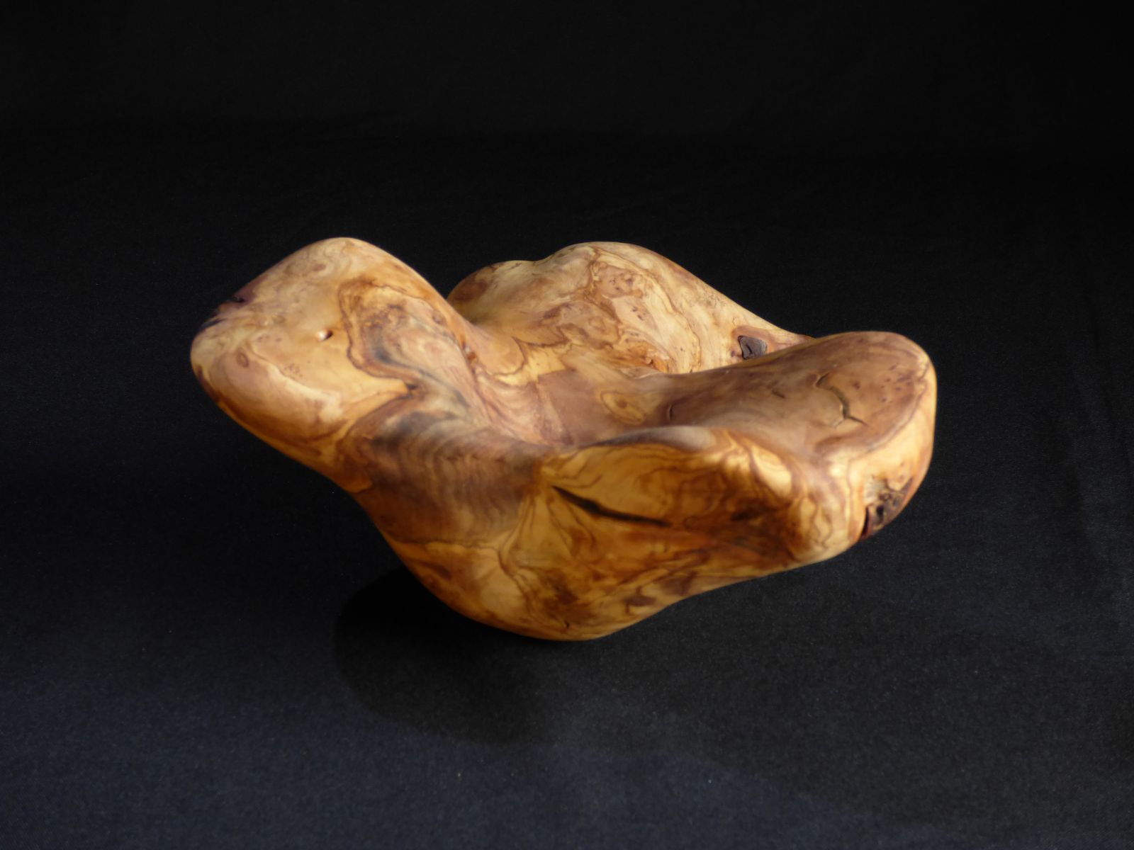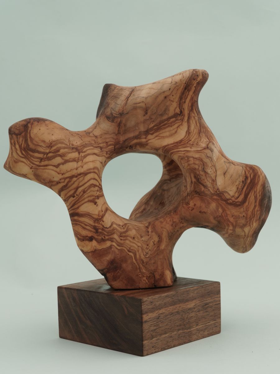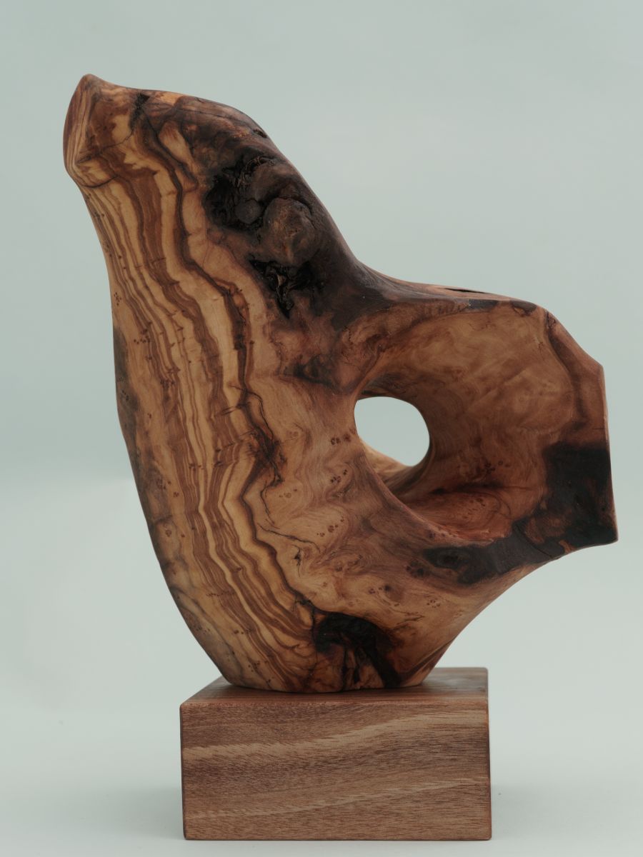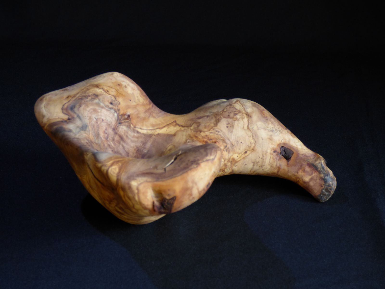 olijfboom. Ik wilde er een ruwe abstracte sculptuur van maken, met uitsteeksel en gaten. Maar toen ik eenmaal bezig was haalde ik toch steeds meer uitsteeksel weg, om een mooie glooiende vorm te