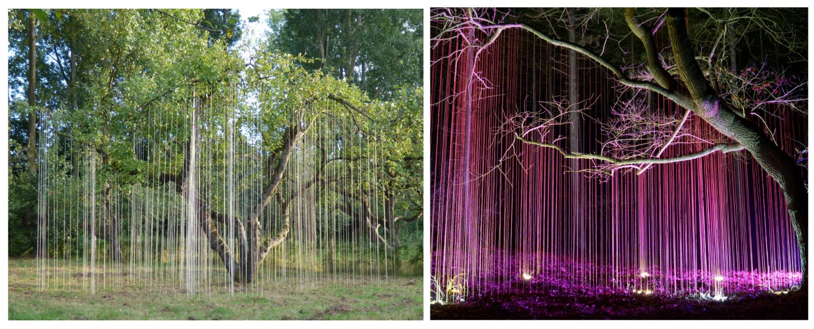 Verbinding.Een boom aan de rand van de vijver in de Overtuin. Een veelheid van draden verbindt de takken van de boom met de grond waaruit deze gegroeid is. De draden zijn als stromen van energie of water tussen de wortels en de takken van de boom. Alle draden vormen samen meerdere lagen parallelle lijnen, die een intrigerend effect geven, zowel van een afstand als van dichtbij. Een heel analoge installaties die, door de draden, ook een heel digitale indruk geeft.