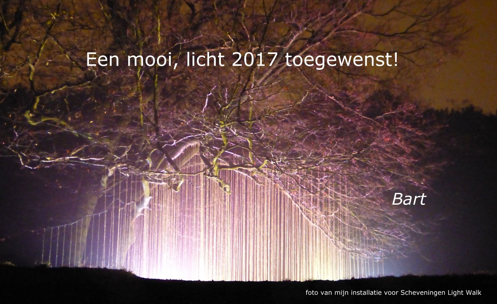 21 december 2016Mijn laatste exposities van dit jaar waren in oktober. Daarna heb ik de tijd genomen om bij te komen van een nogal druk expositiejaar. Maar niet stilgezeten. Op 10 december maakte ik in een grote beuk een lichtinstallatie voor de Scheveningen Light Walk. Twee dagen opbouwen, met hulp, voor 2400 lopers die binnen twee uur voorbij kwamen. Hoewel ze 18,5 kilometer moesten lopen bleven velen een tijd staan, liepen de installatie in, genoten van het lijnenspel, het veranderende licht en de muziek. Maakten honderden selfies. Je kunt het nog meebeleven op YouTube!