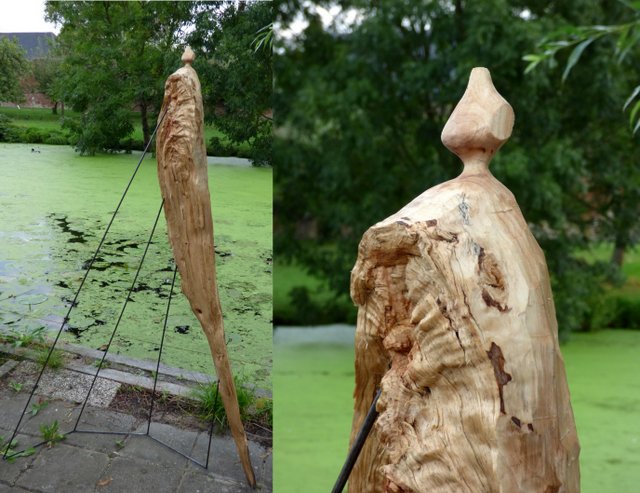 Op Sculpta werkten ongeveer tien kunstenaars aan beelden in hout, metaal of steen, en aan installaties. Ik maakte er een grote vrouwfiguur in lange jurk uit een knotwilg die nog maar net gekapt was. Een worsteling om een gat dat in de rug ontstaan was (ik maak het heel/soms te dun) goed in te passen, maar zoals meestal gelukt. En vervolgens, in samenspraak met anderen, een prachtige plek gevonden om het beeld te plaatsen. Ze loopt, met wapperende jurk een schilderijlijst uit.