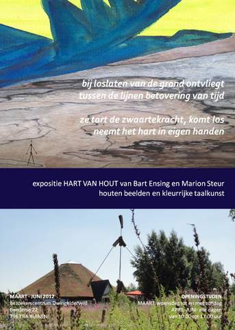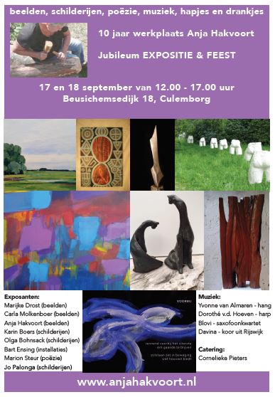 r exposeer ik dicht bij huis, in Culemborg, drie keer zelfs. Op 17 en 18 september bij Anja Hakvoort, collega beeldhouwer in hout, die het tienjarig bestaan van haar bedrijf viert. Dat doet ze bij haar thuis, Beusichemsedijk 18, beide dagen van 12 – 17 uur. Ik plaats er twee installaties.
