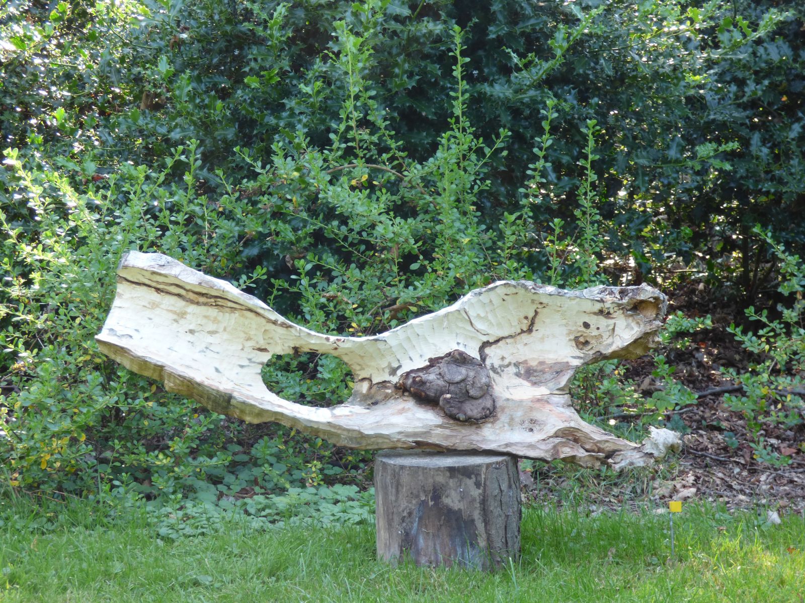 ade; afgebroken takken, omgewaaide en zelfs afgeknapte bomen. Ik zag er echter ook een kans in nam enkele stukken hout mee.Nu, twee maanden later, zijn een aantal stukken te zien in de tuin. Als beelden in wording, want normaal gesproken laat ik hout veel langer drogen. Ik kan ze over een aantal maanden pas afmaken. Eén van de stukken is met name interessant, er bleek een metalen (granaat?)scherf in te zitten. Ik maakte er een liggend torso van, de scherf er nog in.